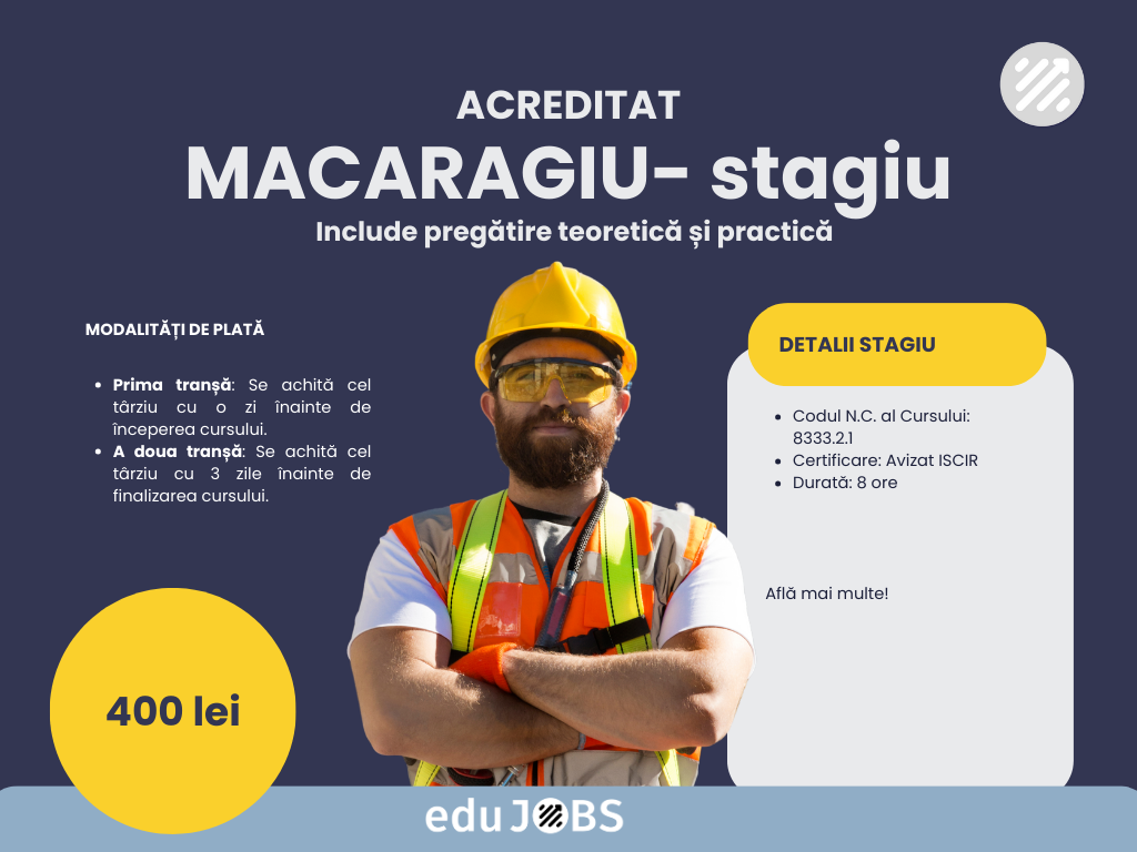 Stagiul pentru macaragii este proiectat pentru a oferi participanților cele mai recente cunoștințe teoretice în domeniul manevrării macaralelor. Acesta acoperă o gamă largă de subiecte, inclusiv tipurile de macarale, elemente de bază în mecanică, metode de utilizare a macaralelor, verificarea stării tehnice, întreținerea, repararea și ce măsuri de prim ajutor trebuie luate în caz de avarii și accidente.