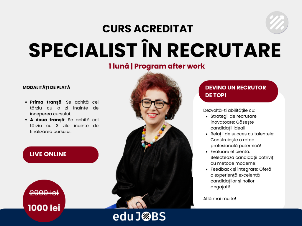 Cursul nostru de Specialist în Recrutare este recunoscut la nivel național și internațional și este elaborat în strânsă colaborare cu experți de top în domeniul recrutării. Certificarea pe care o vei obține îți va putea deschide nenumărate oportunități într-unul dintre cele mai dinamice domenii ale sectorului HR. Devino un agent de schimbare în lumea recrutării și ajută companiile să își realizeze viziunea prin talentul pe care îl descoperi. Înscrie-te la curs și începe călătoria profesională alături de noi!