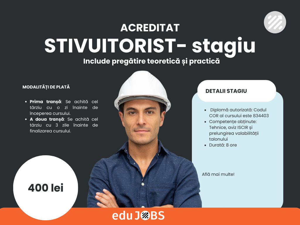 Stagiul nostru este dedicat stivuitoristilor care doresc să se perfecționeze și să se alinieze la cele mai recente tehnologii și practici din domeniu. Cursul oferă o combinație de teorie privind diferite tipuri de stivuitoare, modalități de utilizare corectă și sigură, precum și proceduri exacte de întreținere și reparație. De asemenea, stagiul pune un accent deosebit pe măsurile de prim ajutor necesare în cazul producerii de avarii sau accidente.
